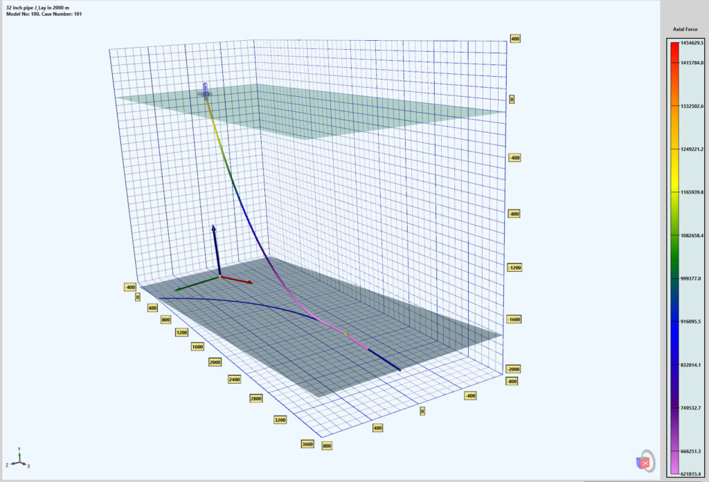 Pipelaying under currents and waves in 750 m water depth. PLDYNA calculates the required barge offset and alignment from the pipeline route to ensure that touchdown point remains on the pipeline route and the pipe tangent is oriented along the route.