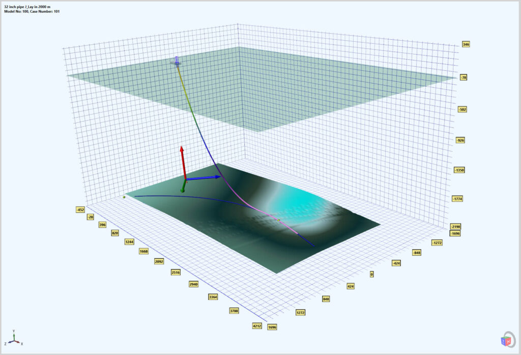 32 inch pipe being laid to a curved proprietary profile route under currents and waves in 2000 m water depth on a 5 degree sloped sebed. Slope heading 20 degree from pipeline route. PLDYNA calculates the position and alignment of the barge to ensure touchdown actually follows the design route.