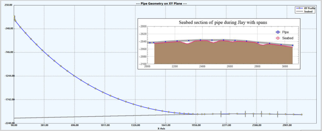 Pipelaying under currents and waves in 750 m water depth. PLDYNA calculates the required barge offset and alignment from the pipeline route to ensure that touchdown point remains on the pipeline route and the pipe tangent is oriented along the route.
